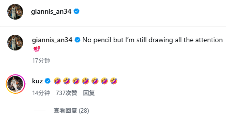 字母哥在13分钟前发布了ins,并附文:“不用纸笔,我依然能吸引所有目光。”