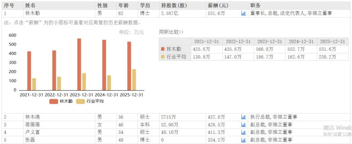 其中,董事长林木勤2025年薪酬由2024年同时的552.7万元下调至531.6万元,减少了21.1万元,但仍为公司高管中的最高薪酬。而他的弟弟、公司实践总裁林木港2025年薪酬为437.8万元,相较于2024年的496.1万元,下落了58.3万元,ag百家乐薪酬在公司高管中仅次于林木勤。