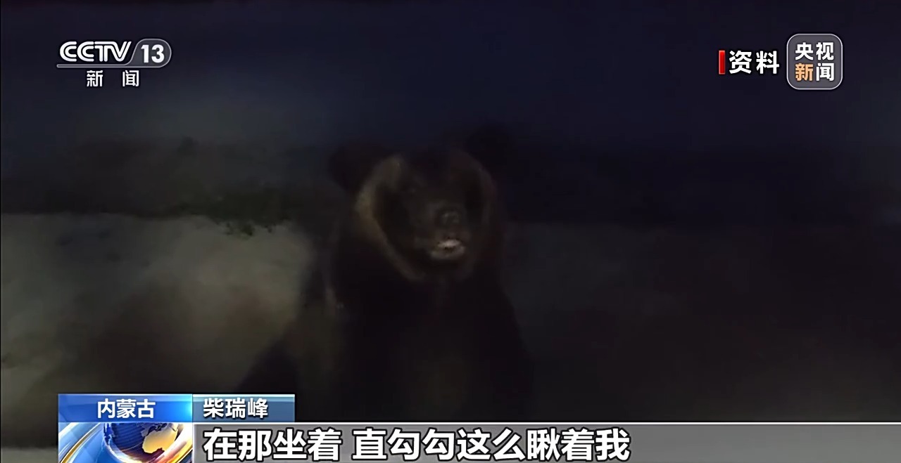 柴瑞峰:我就拿手机往后面一照,突然看见一只黑熊,它离我就四五米远的距离上,在那坐着,直勾勾这么瞅着我,这个手机的亮光,照在这个熊的眼睛上,它冒那个光。当时心里就特别特别害怕,跟前有一棵树,我顺着那棵树爬上去了。