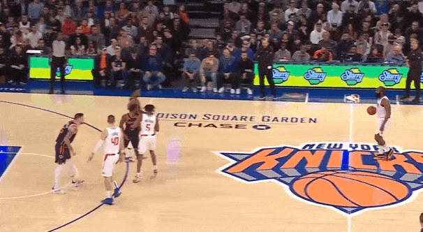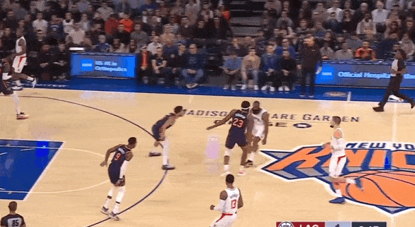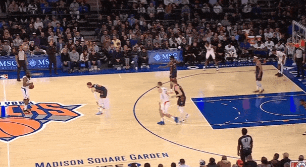 中圈位置直接和祖巴茨发动挡拆配合,挡拆行进间见迪文走下线穿过,立即使用垫步急停坚决出手超远持球三分,顶着迪文扑防手起刀落。