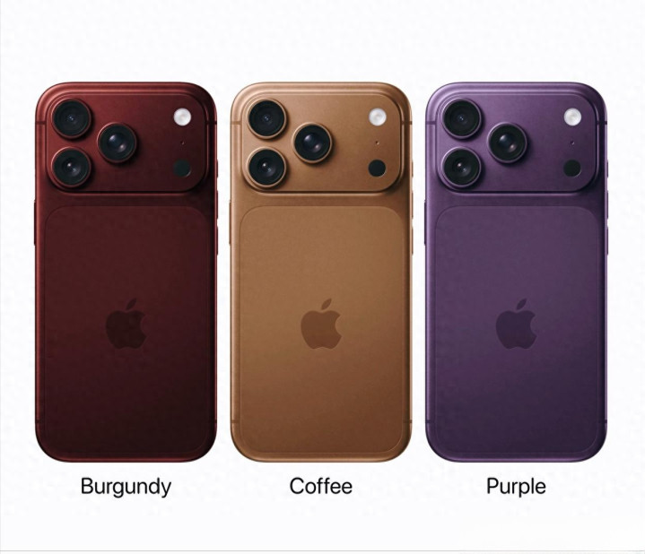 三款不同配色的iPhone :展示酒红、咖啡、紫色的iPhone后面