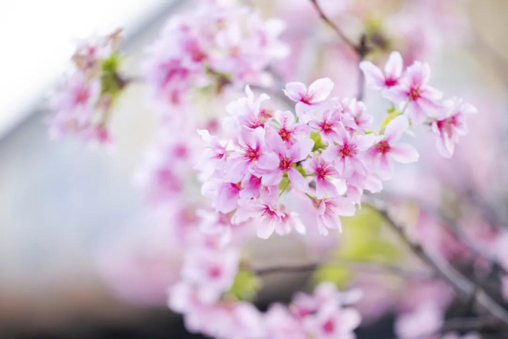 一簇簇粉色的樱花探出