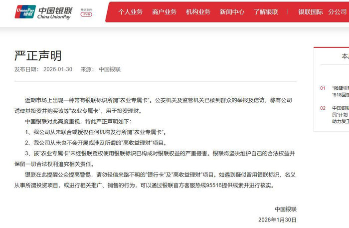 近期,市场上出现带有银联标识的所谓“农业专属卡”,有不法机构以“乡村振兴”“高收益理财”为噱头推广该卡片,吸引群众购买参与投资理财。公安机关及监管机关已接到相关举报与信访,1月30日,中国银联发布《严正声明》,明确澄清相关乱象,直指该类卡片为虚假产品,相关推广行为涉嫌违规违法。