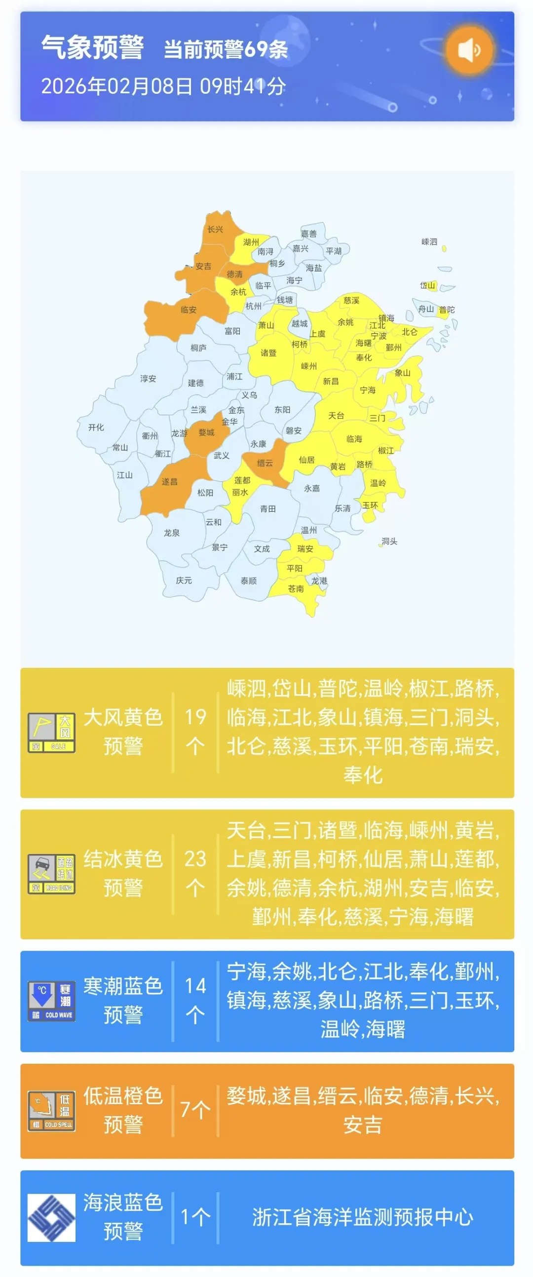 截至9时40分,共69条气象预警在“忙碌”,其中有23个结冰黄色预警,7个低温橙色预警。