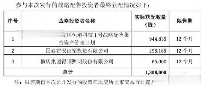本次刊行计策配售股份共计130.8万股,ag百家乐官网占本次刊行限制的10.00%(不含逾额配售部分股票数目),刊行价钱为21.80元/股,计策配售召募资金金额共计2851.44万元。