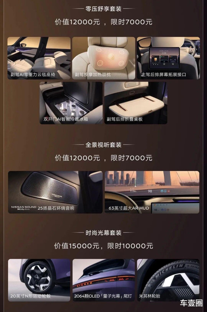 临了再来聊聊选装包。关于不缱绻上品牌众人版(默许标配三个选装包)、但又但愿进一步晋升体验的用户,东风日产提供了三个限时超廉价的选装包。零压舒享套装(限时7000元)包含智能冷暖雪柜、副驾零重力座椅、折叠桌板等,家里有小孩或平常远程出行的家庭会极端受用,况兼价钱也零碎引诱。
